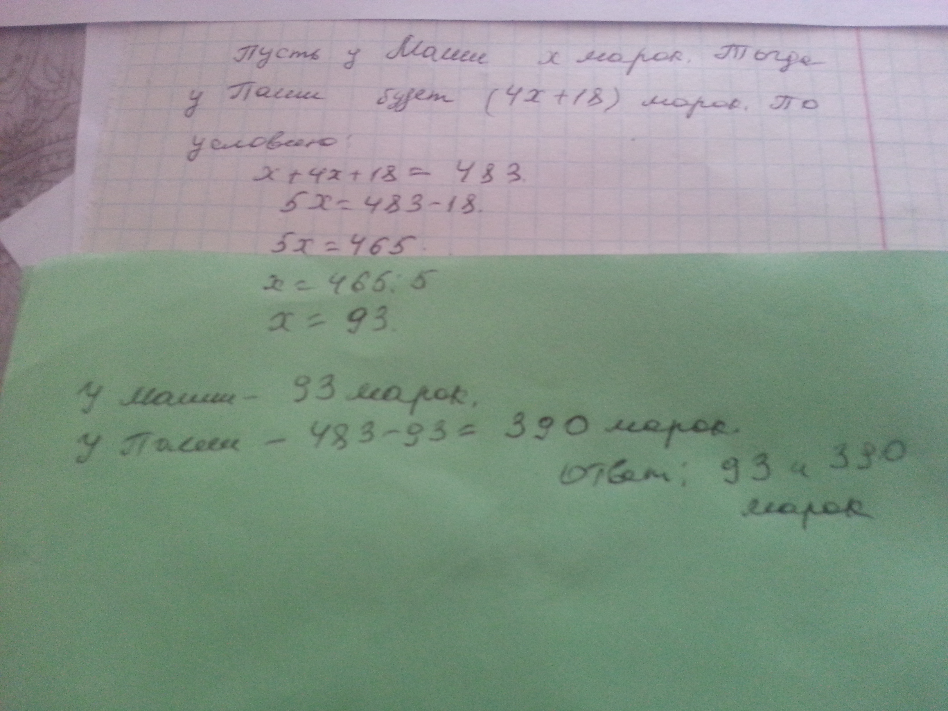 у паши и маши 483 марки у паши в 4 раза больше марок чем у маши и ещё 18 марок