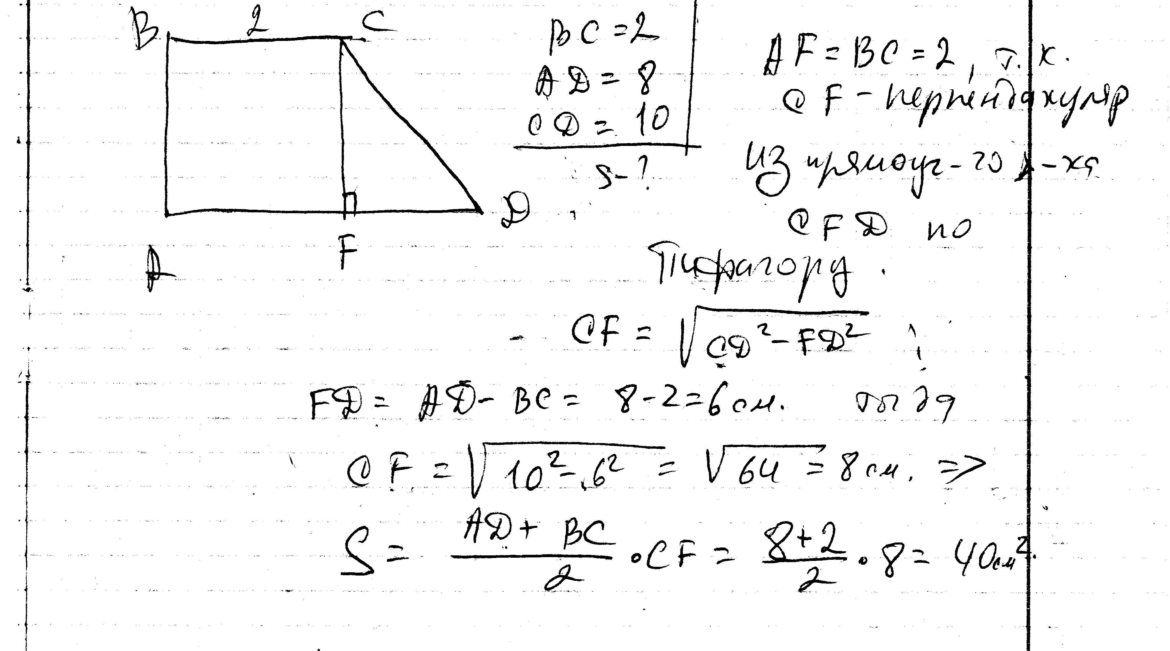 Найдите площадь прямоугольной трапеции основания которой равны 2 см и 8 см,а большая боковая сторона 10 см