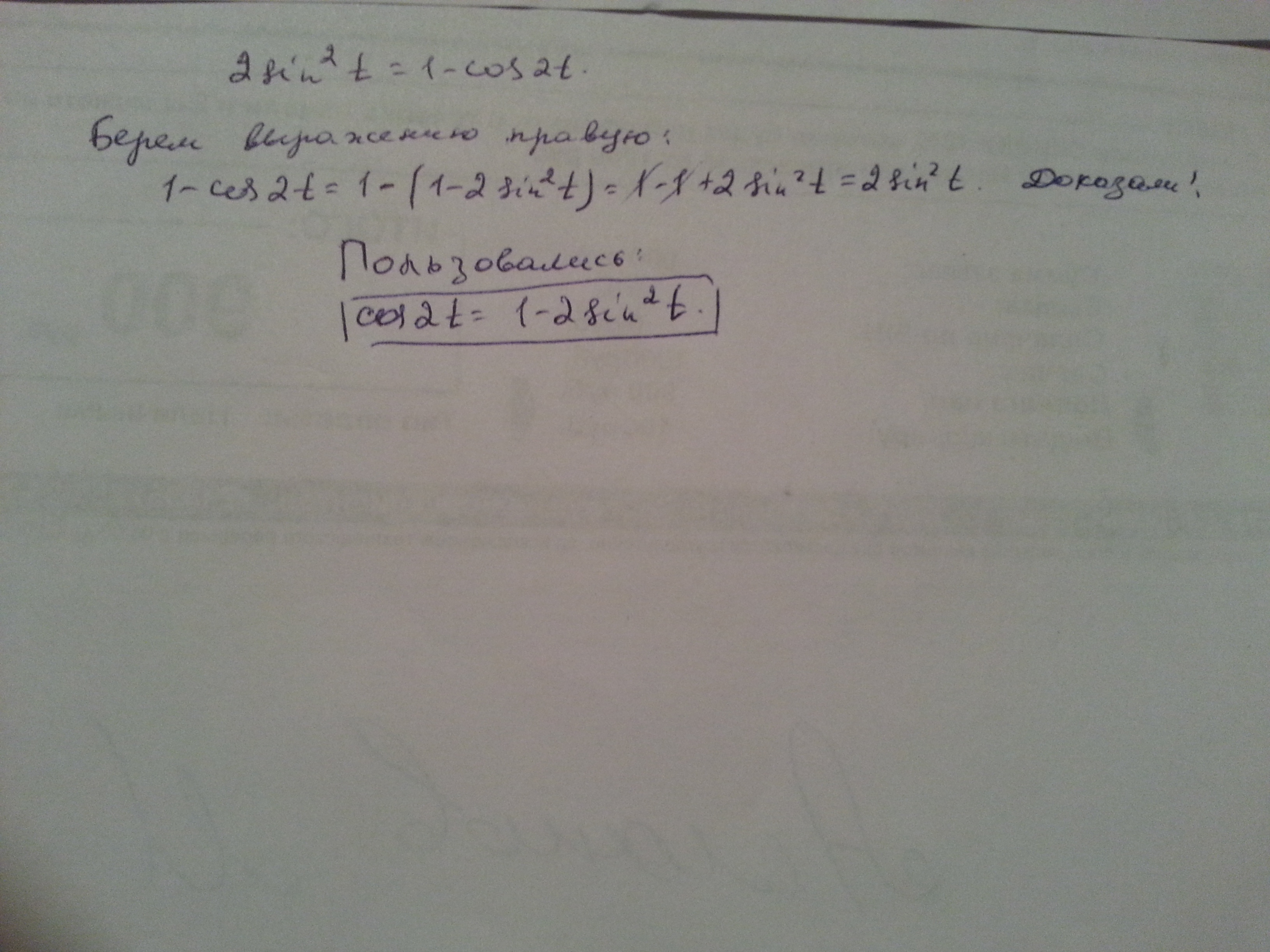 2sin²t =2sint*sint = 2* ((cos(t -t) - cos(t+t) )/2 = 1 -cos2t