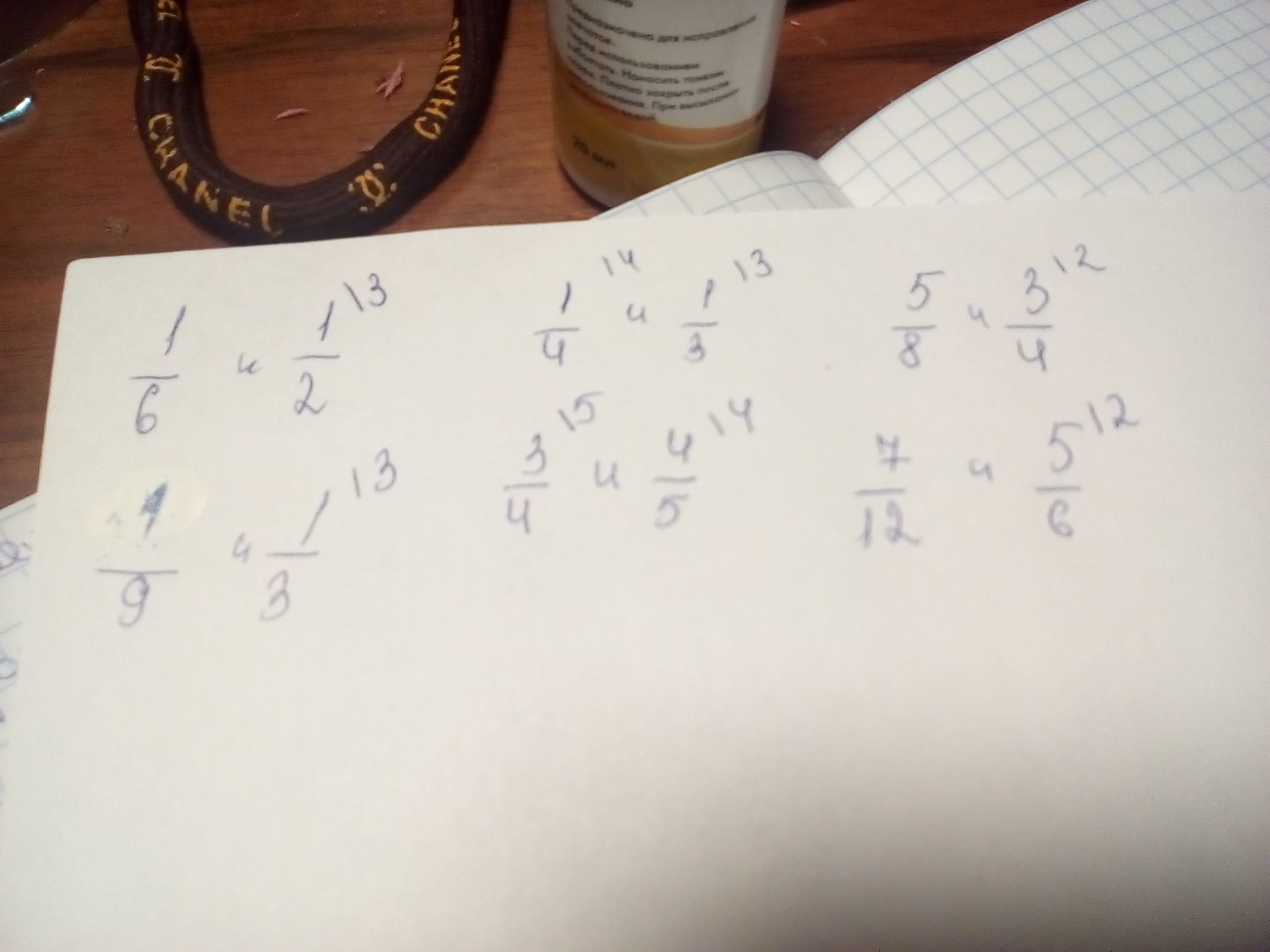 Приведите дроби к наименьшему общему знаменателю 1/6и1/2;1/9и1/3;1/4и1/3;3/4и4/5;5/8и3/4;7/12и5/6.пожалуйста напишите с решением.