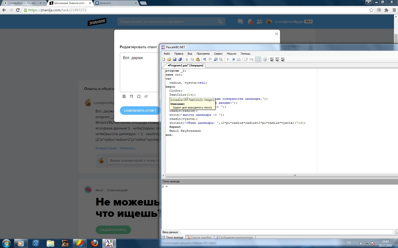 Составте программу (паскаль) которая должна вычеслить прощадь поверхности целиндра по формуле S=2Rh+2(R*R),радиус основания цилиндра(R)и высота(h)вводятся с клвиатуры!(Если надо что-то пояснить, обращайтесь)