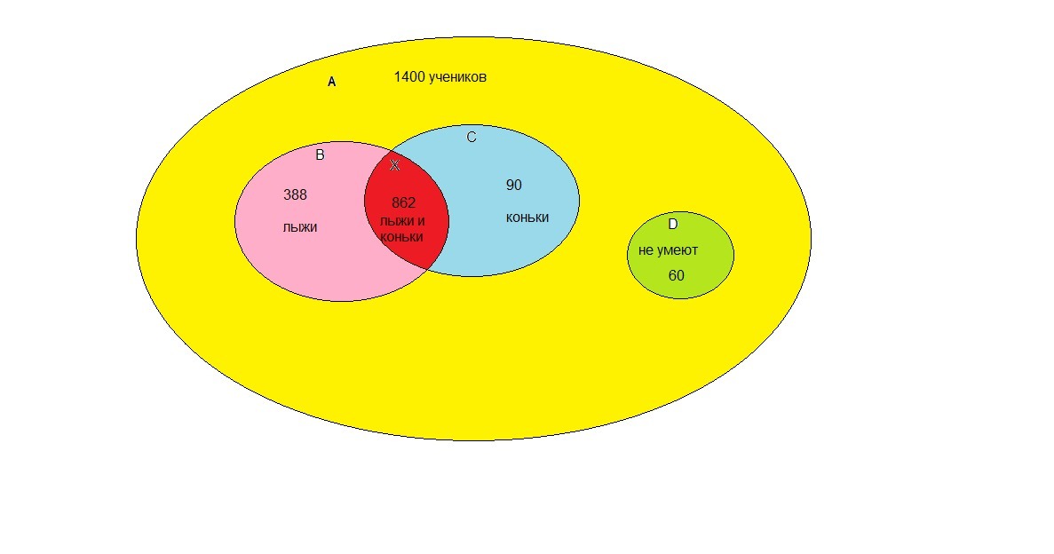 В школе 1400 учеников. Из них 1250 умеют кататься на лыжах, 952 - на коньках. Ни на лыжах , ни на коньках не умеют кататься 60 учащихся. Сколько учащихся умеют кататься и на лыжах , и на коньках?