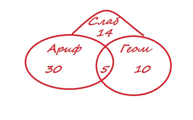 В олимпиаде учавствавало 54 человека . Арифметическую задачу решили 30 чел , геометрическую - 10 чел , 5 и ту и другую , Сколько человек решило : только Арифметическую , только геометрическую , Не решило вообще ни одной. СПОМОЩЬЮ КРУГОВ ЭЙЛЕРА.
