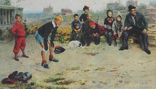Мальчики играют, а портфели лежат рядом. Получается, что игра перехватила их по дороге домой. Они так увлечены, что их не волнует время, уроки и прочие прелести жизни.