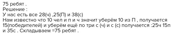 В пионерском лагере Орлёнок в смене актива отдыхали: 28 человек, 25 победителей олимпиад и 38 спортсменов. 10 человек были и отличниками и победителями олимпиад, 3 - и отличниками, и спортсменами, и победителями олимпиад.Сколько ребят отдыхали в лагере?