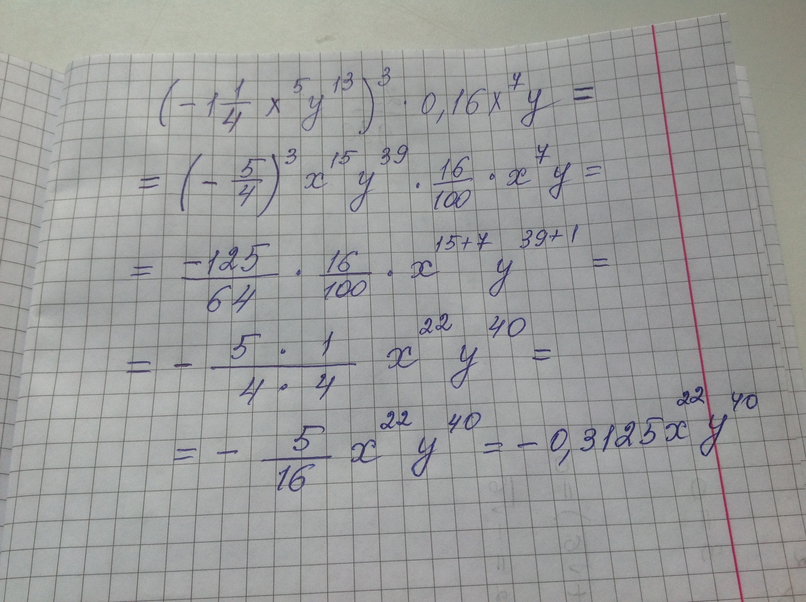 Упростить: (-1/1/4 x5 y13)3*0,16 x7 y