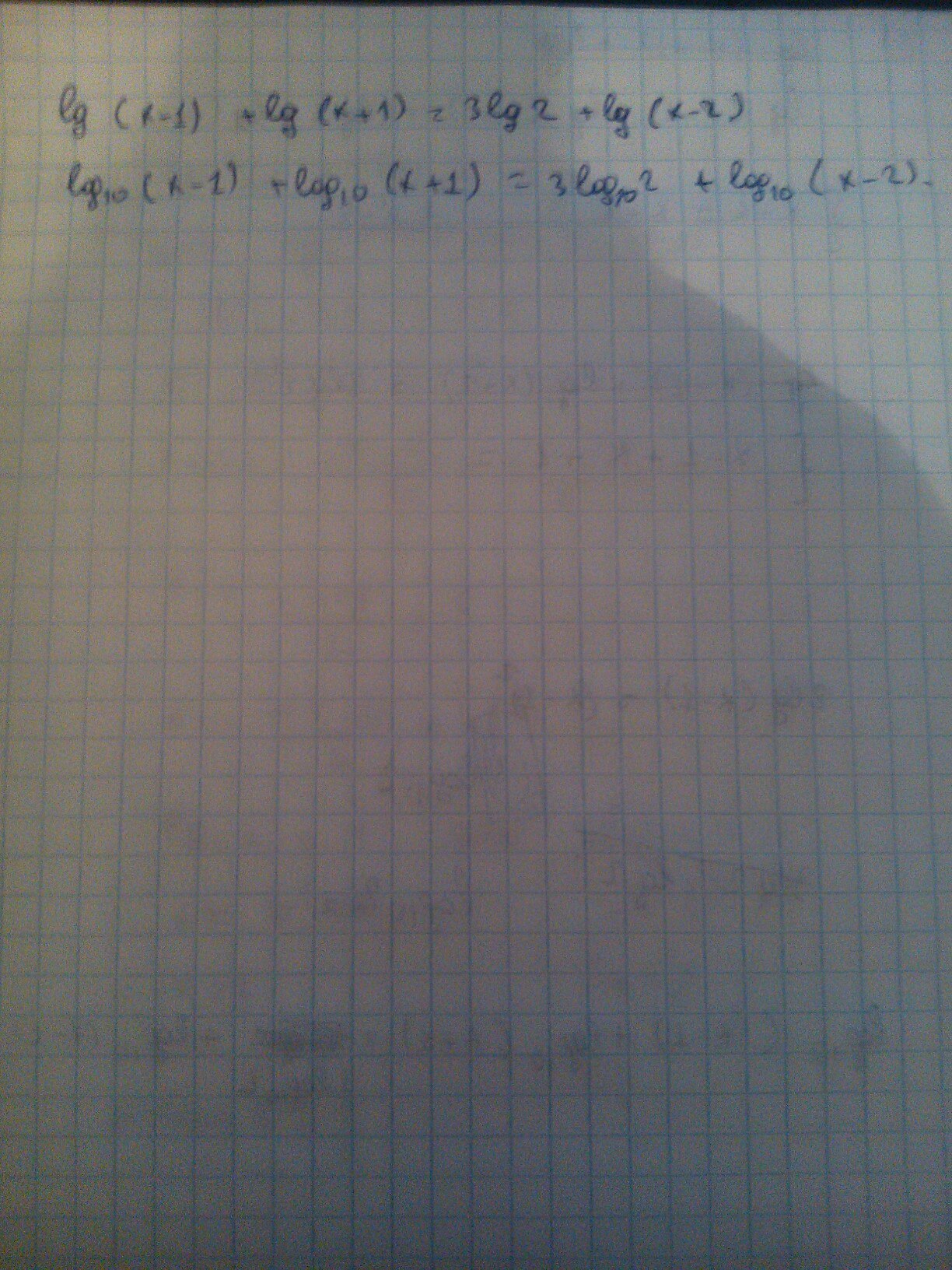 log10(x-1)+log10(x+1)=3log10(2)+log10(x-2), log10(x-1)+log10(x+1)=3log(2)+log10(x-2), x є (2, +∞), log10((x-1)*(x+1))=log10(2³)+log10(x-2), log10(x²-1)=log10(2³*(x-2)), log10(x²-1)=log10(8(x-2)), log10(x²-1)=log10(8x-16), x²-1=8x-16, x=5, x є (2, +∞), x=3, Ответ: x=5, x=3