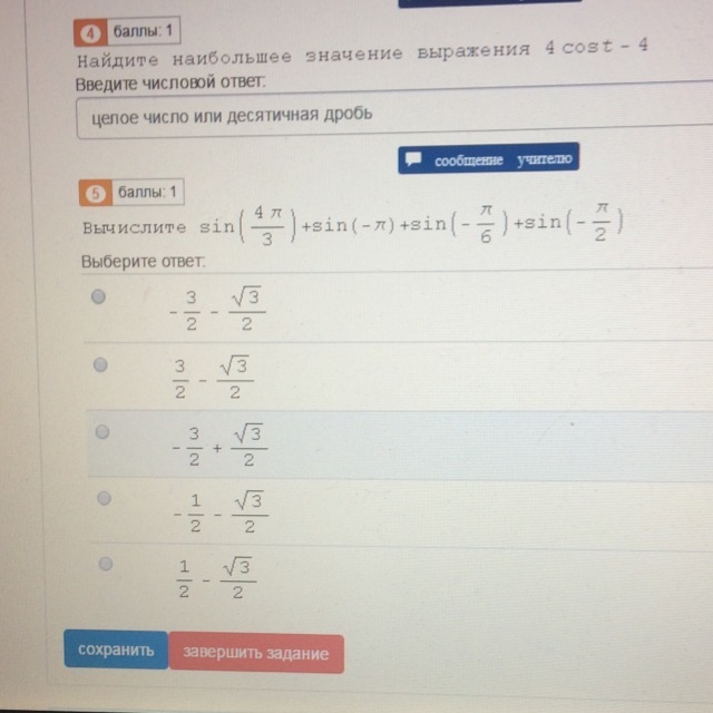 1)quad y=4cost-4\\-1 leq cost leq 1\\-4 leq 4cost leq 4\\-8 leq 4cost-4 leq 0\\y(naibol.)=0\\2)quad sin(frac{4pi}{3})+sin(-pi )+sin(-frac{pi}{6})+sin(-frac{pi}{2})=\\=sin(pi +frac{pi}{3})-sinpi -sinfrac{pi}{6}-sinfrac{pi}{2}=\\=-sinfrac{pi}{3}-0-frac{1}{2}-1=-frac {sqrt3}{2}-frac{3}{2}; ;\\Otvet :; ; #1; .