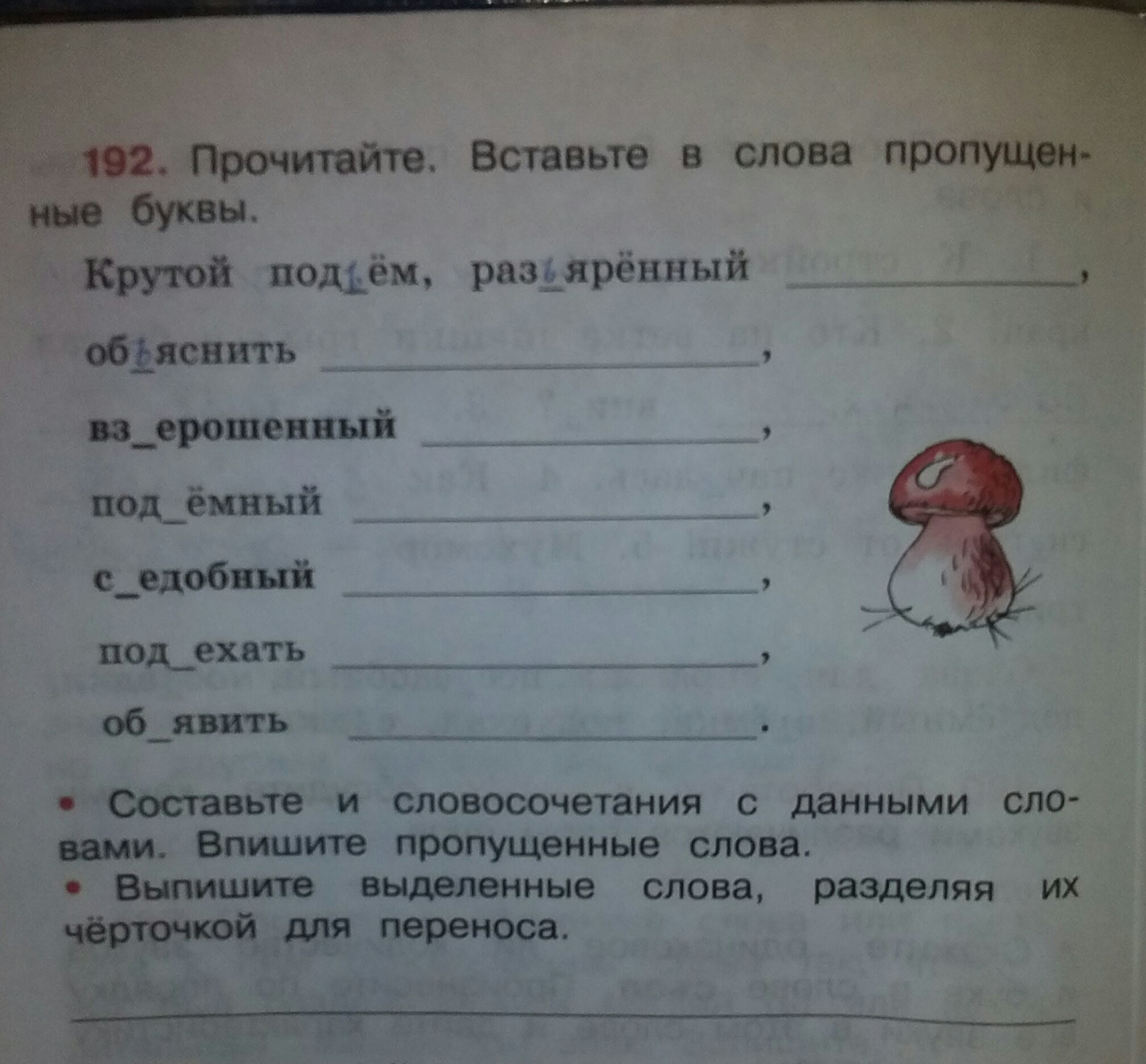 Везде в пропусках твердый знак. Слова на месте пропусков: Бык, задачу, пес,кран, гриб, к дому, голодовку.