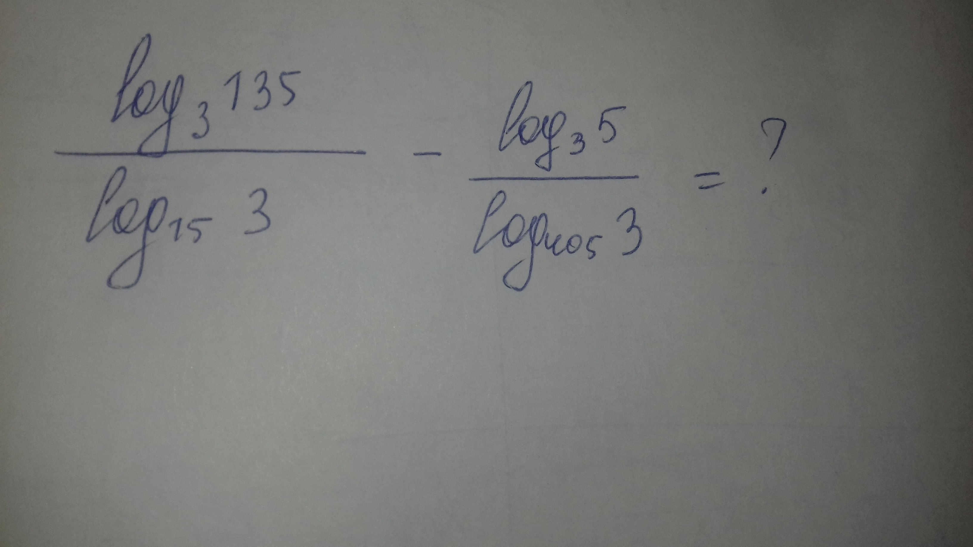 displaystyle  frac{log_3135}{log_{15}3}- frac{log_35}{log_{405}3}= frac{log_3135}{ frac{1}{log_315}}- frac{log_35}{ frac{1}{log_3405}}=