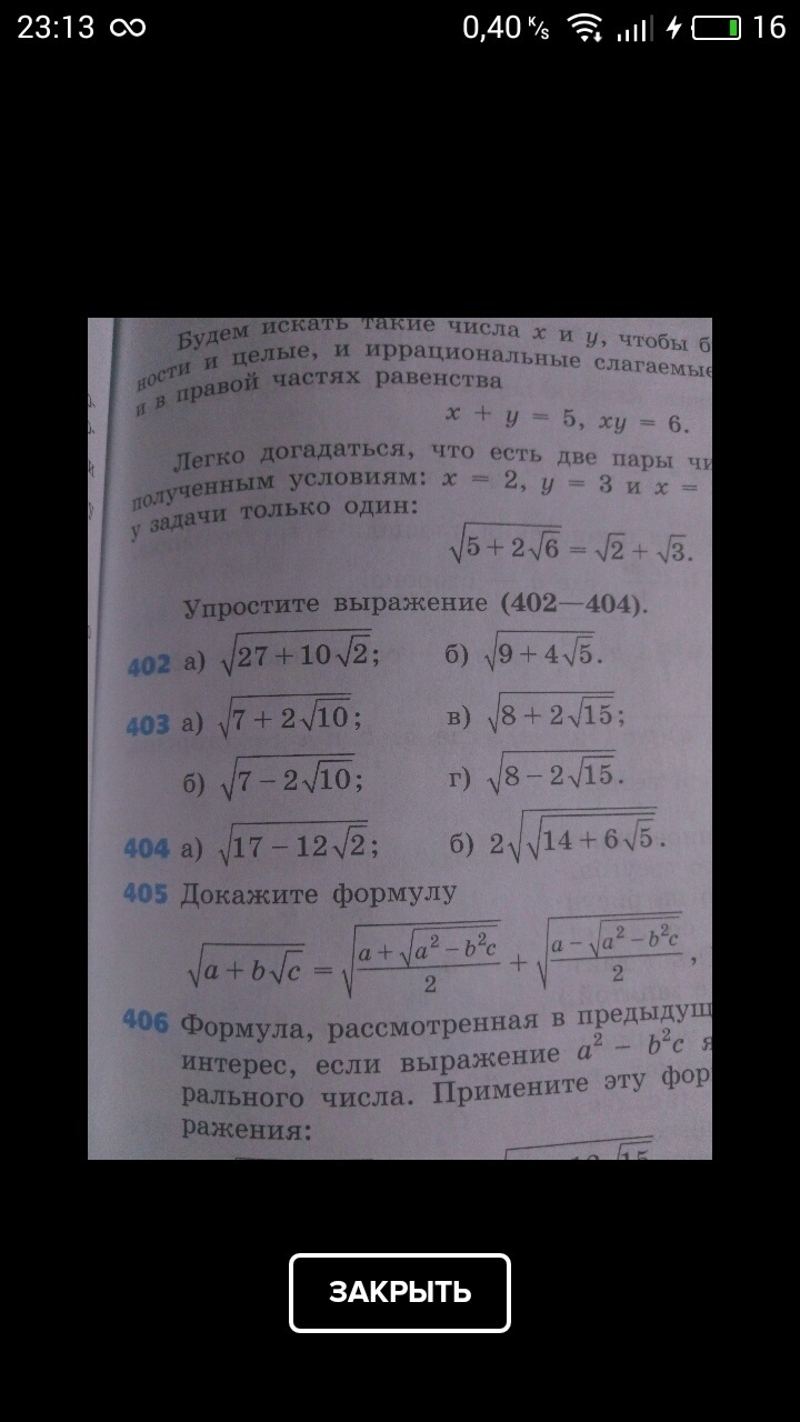 под корнем надо собрать полный квадрат. (a+b)^2=a^2+b^2+2ab либо (a-b)=a^2+b^2-2ab. #402 а) 10√2 это удвоенное произведение 2ab, на 2 можно сократить, получается 5√2=ab. a^2+b^2=27, значит нам надо разложить 5√2 так, чтобы в сумме их квадраты давали 27. эти числа 5(5*5=25) и √2(√2*√2=2). 25+2=27 б) 2ab=4√5, ab=2√5, a^2+b^2=9. a=2(2*2=4), b=√5(√5*√5=5). 5+4=9. #403 a) 2√10=2ab, √10=ab, a^2+b^2=7, a=√5,b=√2, в примере б) все то же самое, только с минусом, т.к. перед 2ab стоит минус