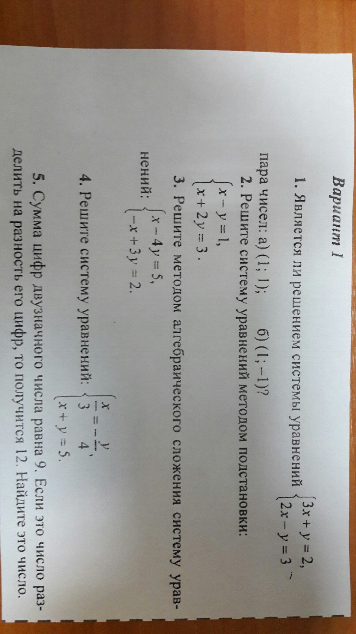 5) а+b=9 (10a+b)/(b-a)=12 b=9-a 10a+9-a=12(9-a-a) 9a+9=108-24a 33a=99 a=3, b=6 Ответ: 36 4) Х/3=-у/4 Х+у=5 Подстановка: Х=5-у 5-у/3=-у/4 выравниваем знаменатель 4*(5-у)=3*(-у) 20-4у=-3у 20=-3у+4у 20=у Подставляем Х+у=5 Х=5-20 Х=-15 Проверка: Х/3=-у/4 -15/3=-20/4 -5=-5 Ответ: -15; 20