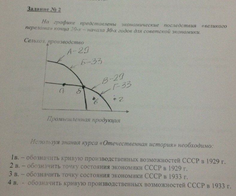 До 1929г. наблюдалось недоиспользование ресурсов, в т.ч. безработицы. Поэтому положение экономики СССР в 1929 г. изображается точкой, лежащей ниже кривой производственных возможностей этого периода.