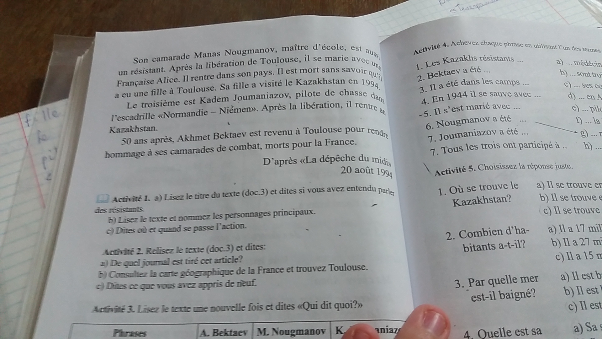 Его товарищ Манас Нугманов, школьный учитель, тоже сопротивляющийся. После освобождения Тулузы он женится на француженке Алисе. Он возвращается в свою страну. Он умер так и не узнав ,что у него есть дочь в Тулузе. Его дочь посетила Казахстан в 1994 году.