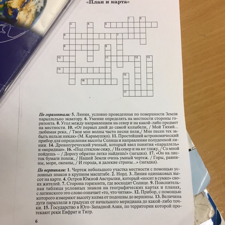 По горизонтали: 5. Параллель; 6. Ориентирование; 8. Азимут; 10. Дон;