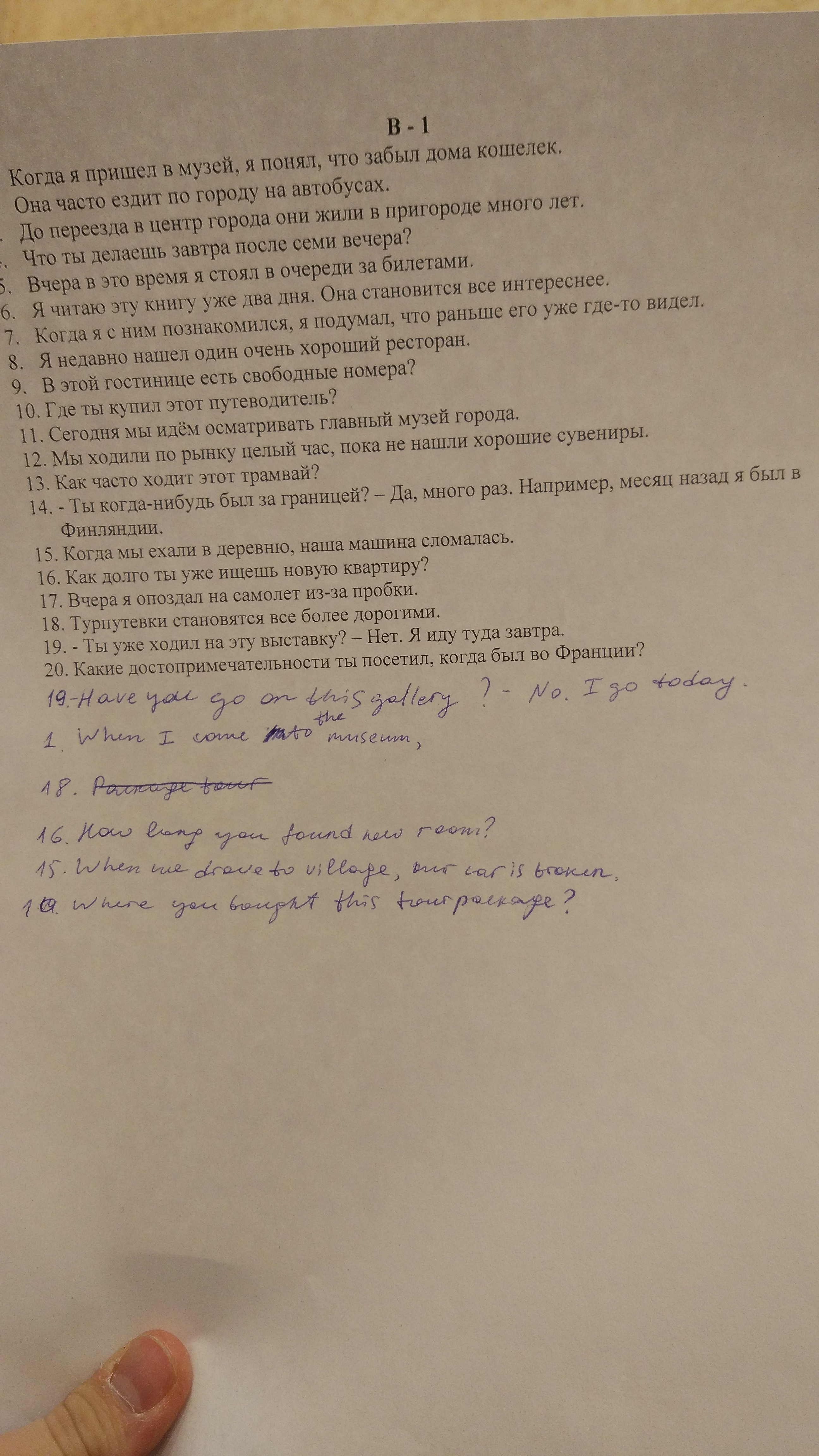 1. When I came to the Museum, I realized that I had left my purse at home.2. She often travels around the city by bus.3. Before moving to the center of town, they lived in the suburbs for many years.4. What are you doing tomorrow after seven in the evening?5. This time yesterday I was standing in line for tickets.6. I read this book for two days. It becomes more and more interesting.7. When I met him, I thought that earlier it already somewhere saw.8. I recently found a very good gift.9. This hotel has availability?10. Where did you buy this guide?11. Today we are going to explore the city's main Museum.12. We walked around the market for an hour until I found good Souvenirs.13. How often does the tram?14. Have you ever been abroad? Yes, many times. For example, a month ago I was in Finland.15. When we went to the village, our car broke down.16. How long have you been looking for?17. Yesterday I was late for the plane because of traffic jams.18. Package tours are becoming more expensive.19. Have you been to this exhibition? No. I'm going there tomorrow.20. What places you visited when you were in France?