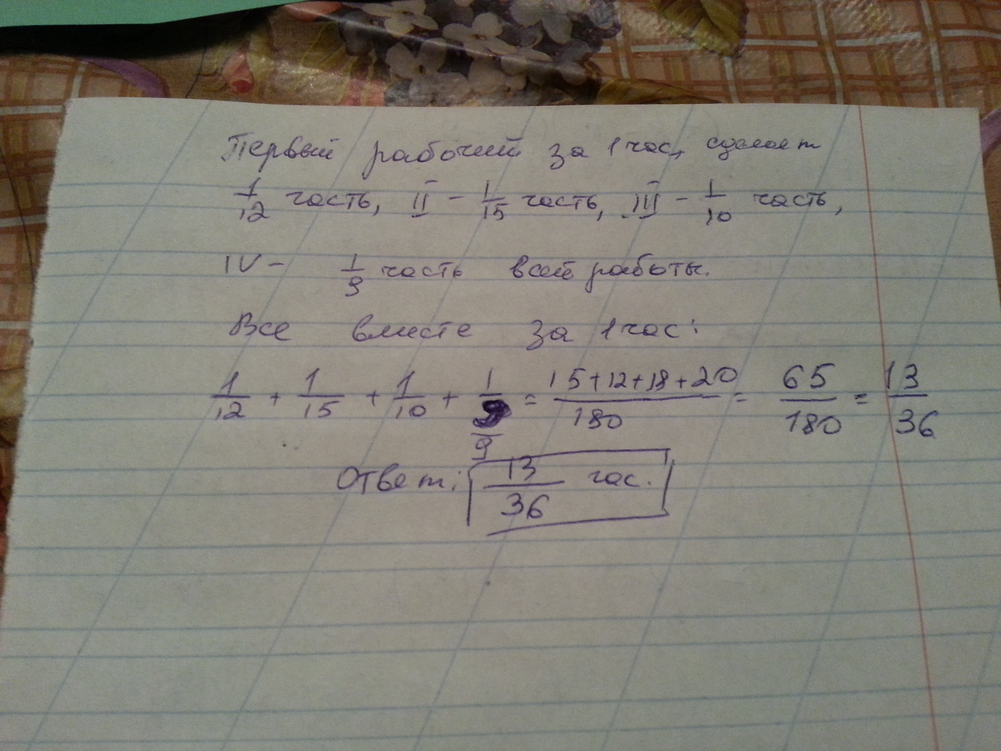 1/12+1/15+1/10+1/9=(15+12+18+20)/180=65/180=13/36 вместе за час