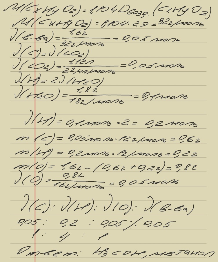 При сжигании 1,6 г органического вещества было получено 1,12 л углекислого газа (н.у) и 1,8 г паров воды. Плотность паров исследуемого вещества по воздуху равна 1,104. Определите молекулярную формулу вещества
