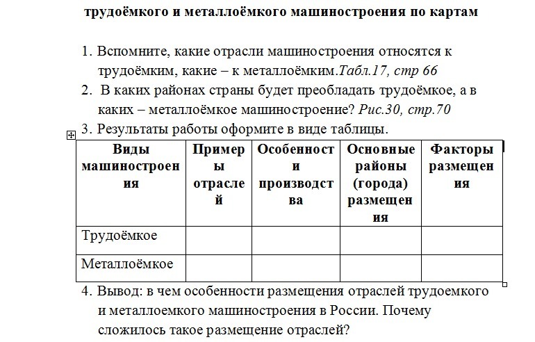 2) Трудоемкое в крупных городах, металлоемкое у металлургических баз.