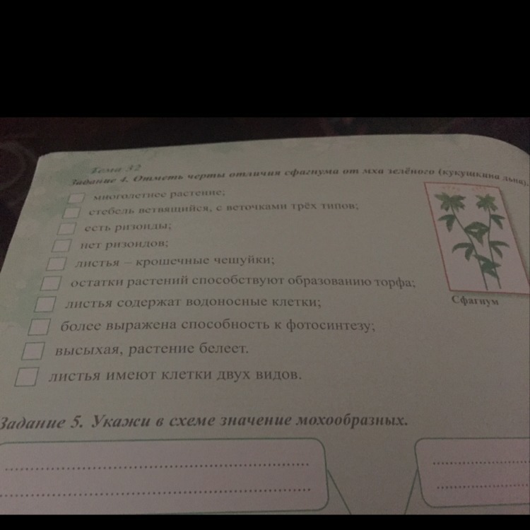Стебель сфагнума ветвящийся, ризоидов нет, способствует образованию торфа, листья содержат водоносные клетки, белеет при высыхании ,листки имеют клетки 2 видов
