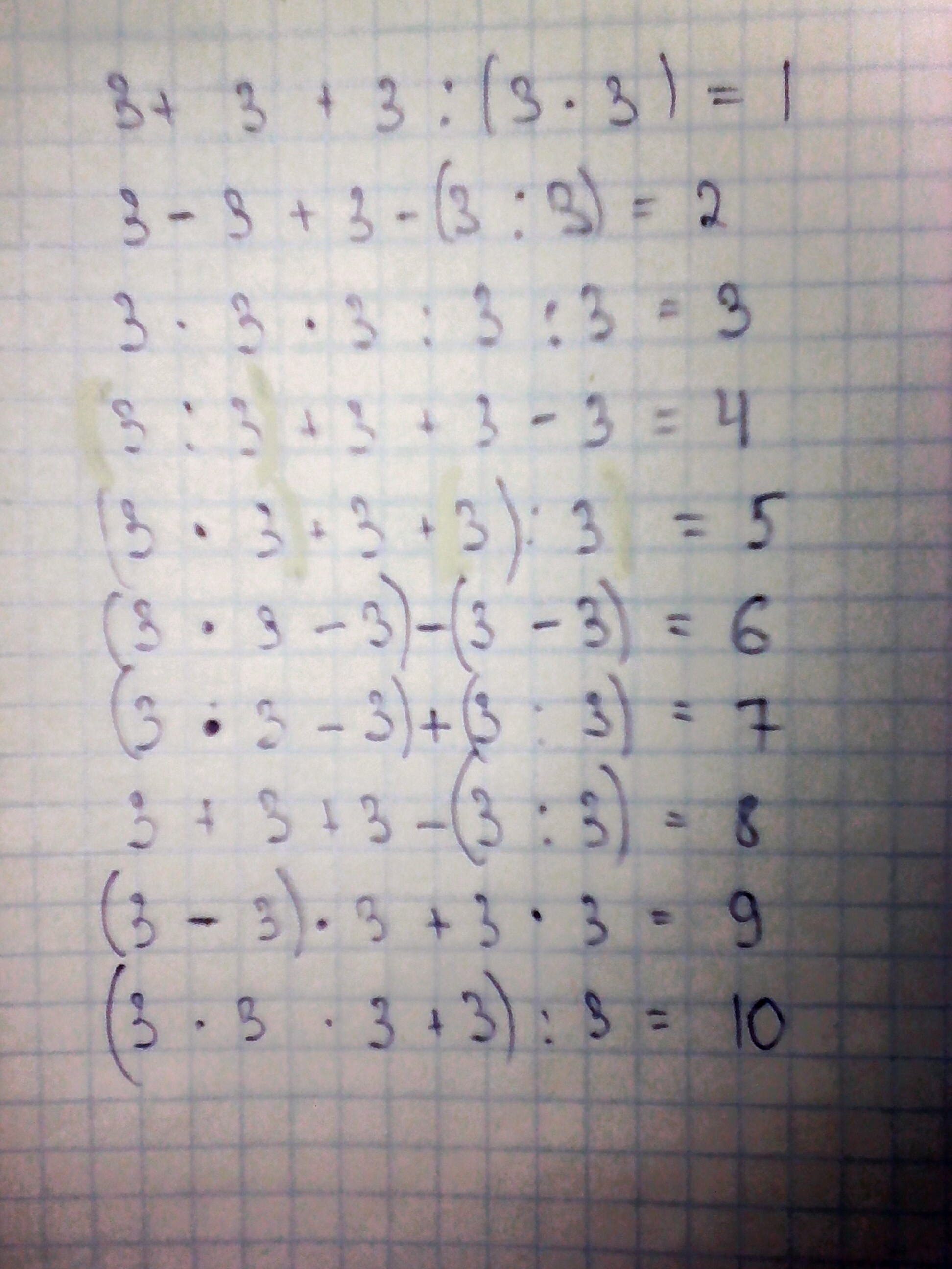 Представить с помощью пяти троек и математических операций,включая скобки,числа от 1 до 10!