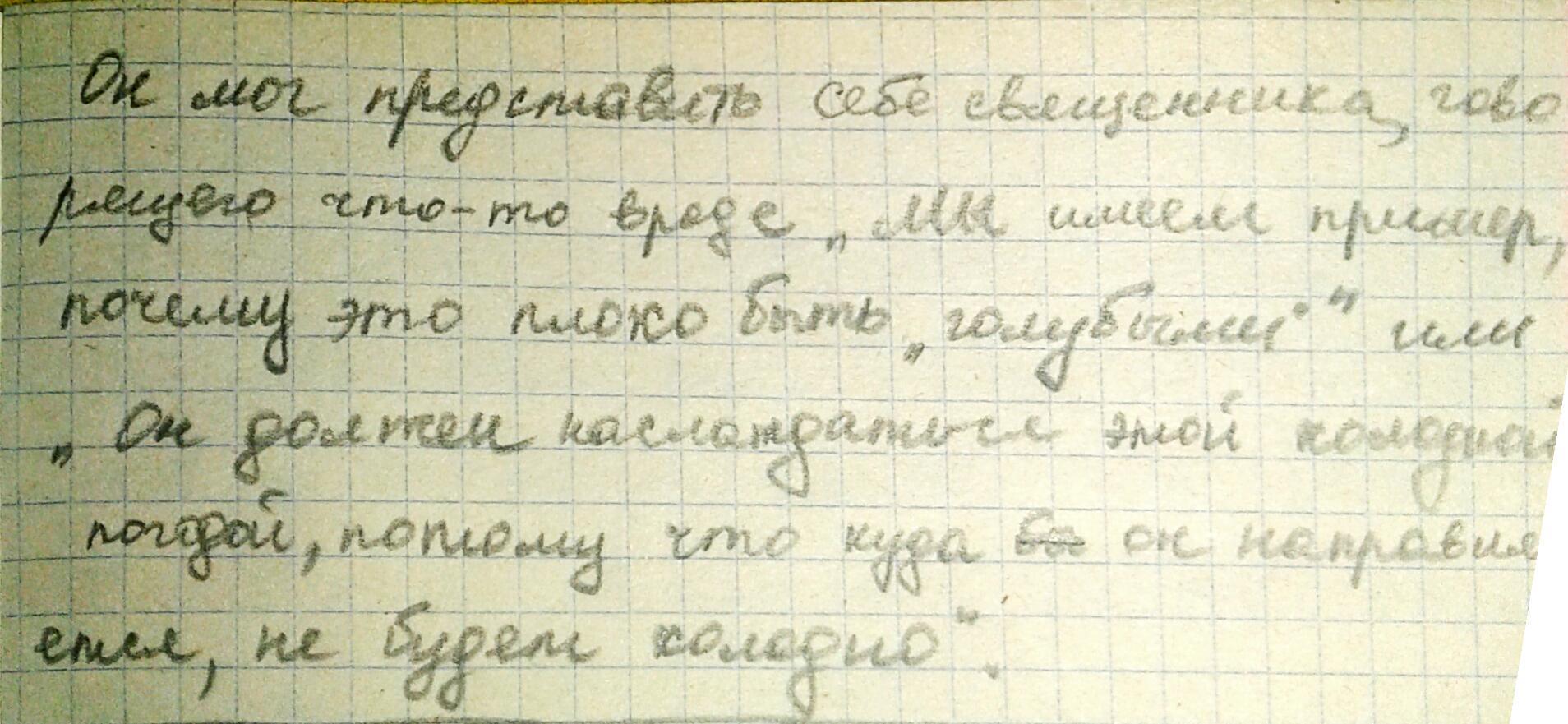 Он мог представить себе священника говорящего что-то вроде: "Вот мы имеем пример того, почему плохо быть голубым". Или: "Ему следует наслаждаться этой холодной погодой, потому что там, куда он направляется, холодно не будет".