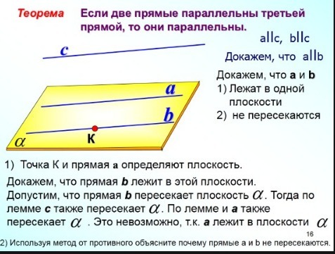 Теорема : Если две прямые параллельны третьей прямой , то они параллельны
