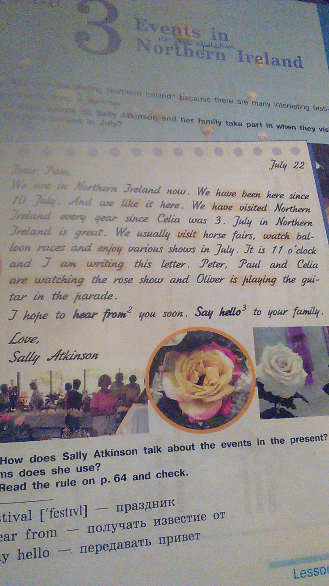 Сейчас мы в Северной Ирландии. Мы находимся здесь с 10 июля. И нам здесь нравится. Мы ездим в Северную Ирландию каждый год с тех пор, как Селии исполнилось 3. Июль в Северной Ирландии великолепен . Обычно мы посещаем конные ярмарки, ???, и наслаждаемся различными гоу в июле. сейчас 11 часов и я пишу это письмо. Питер, Пол и серия смотрят шоу роз и Оливер играет на гитаре на параде.