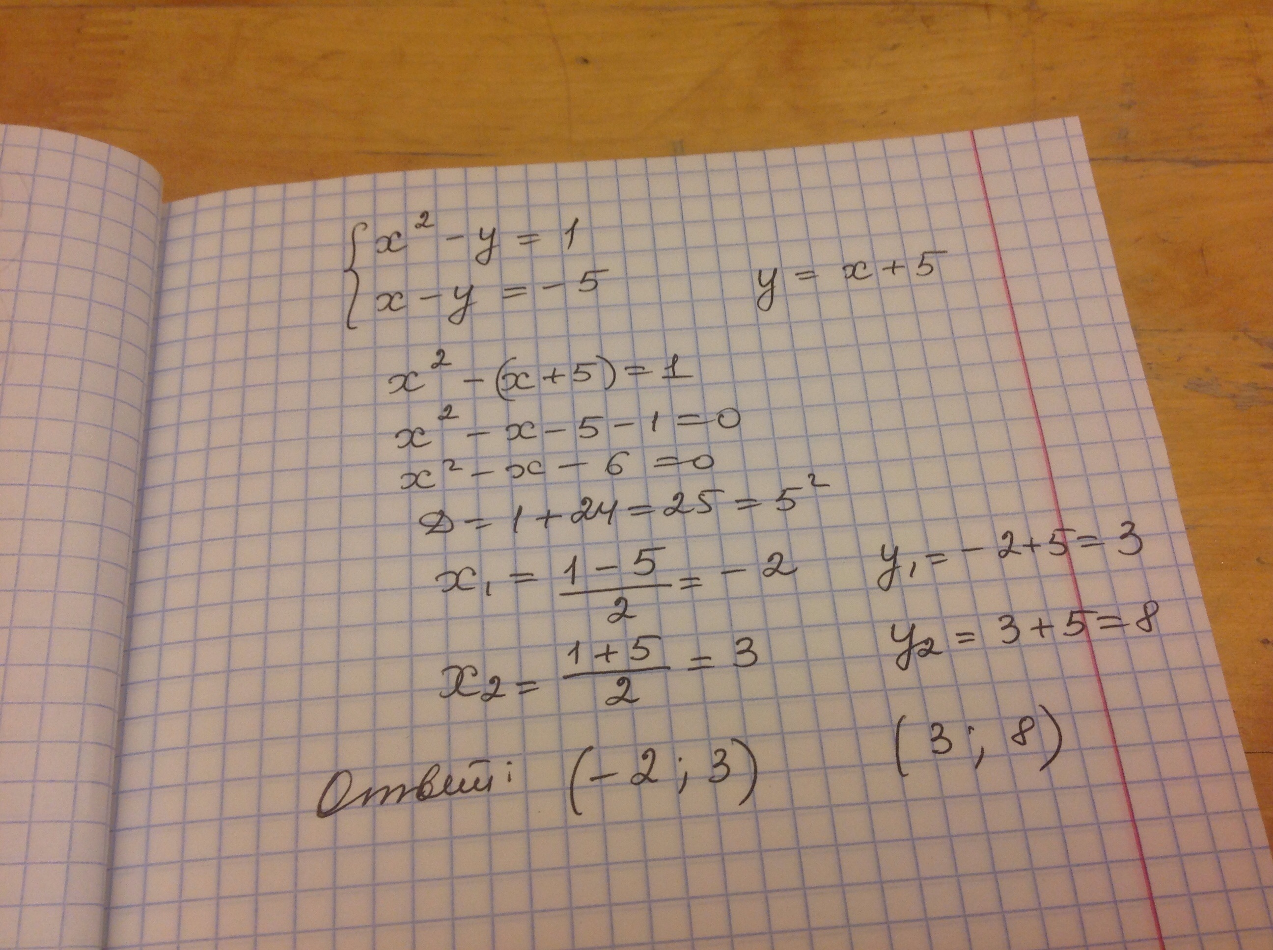 x^2-y=1 x-y=-5