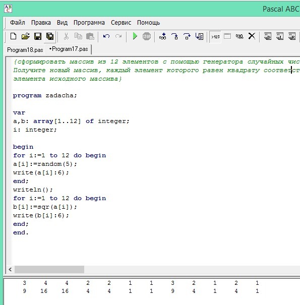 beginfor i:=1 to 12 do begina[i]:=random(5);write(a[i]:6);end;writeln();for i:=1 to 12 do beginb[i]:=sqr(a[i]);write(b[i]:6);end;end.
