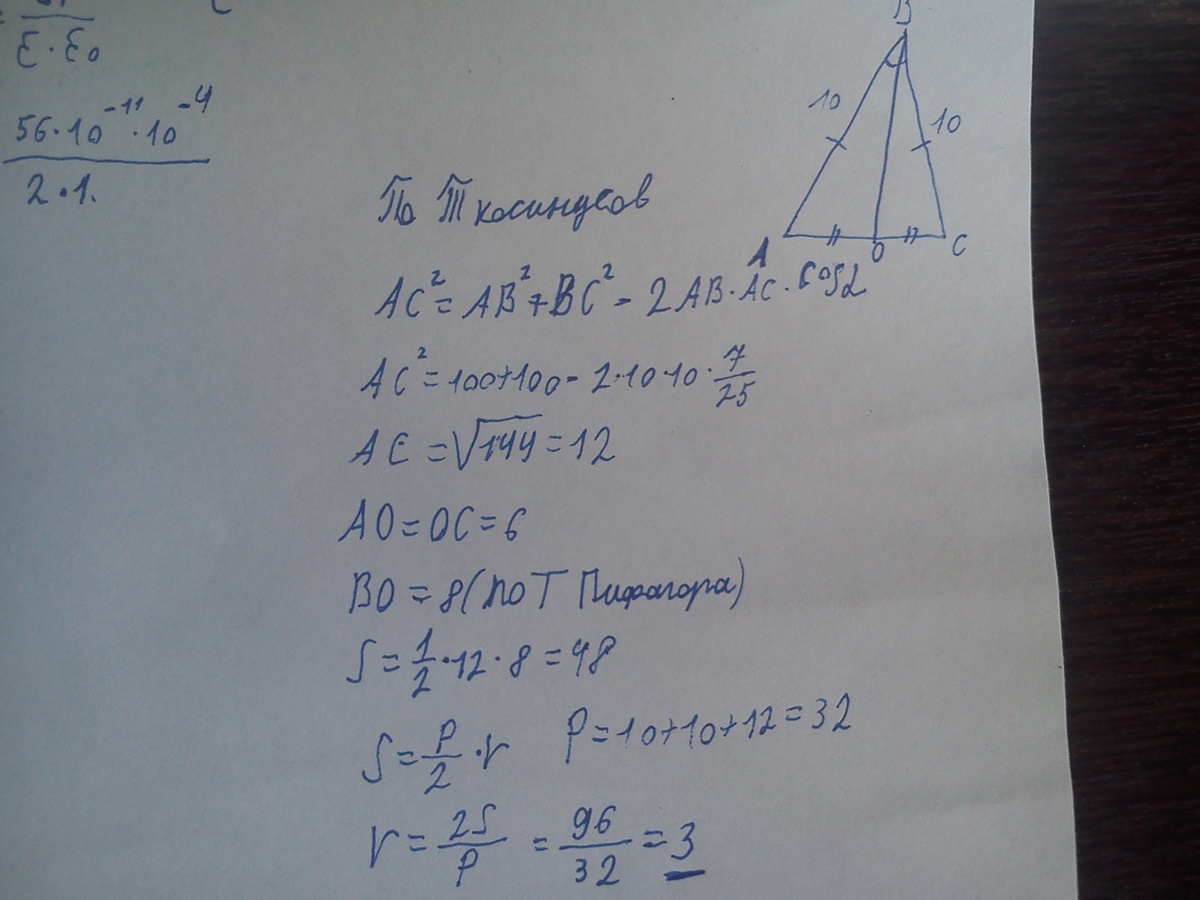 В равнобедренном треугольнике ABC стороны AB=BC=10, cos ABC=7/25.Найдите радиус окружности, вписанной в этот треугольник ABC .