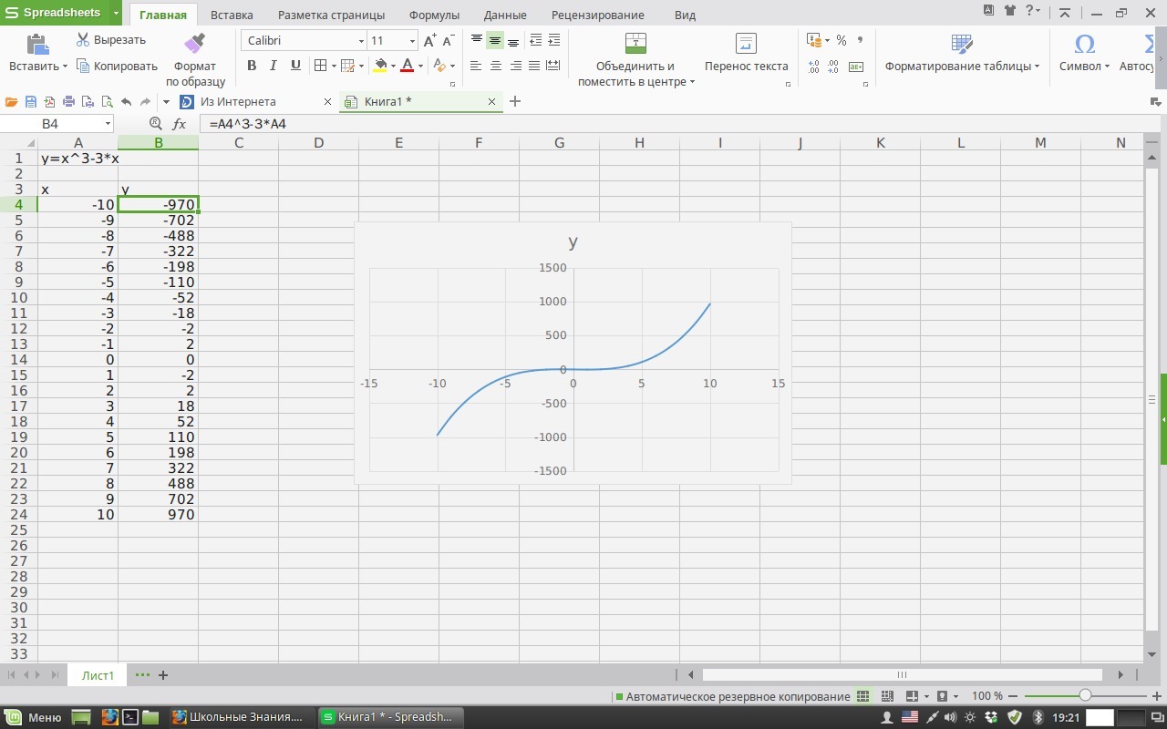 Построить таблицу со столбцами х и у, х будет от -10 до 10 а у с помощью формулы узнаем. И по этой таблице строим график.