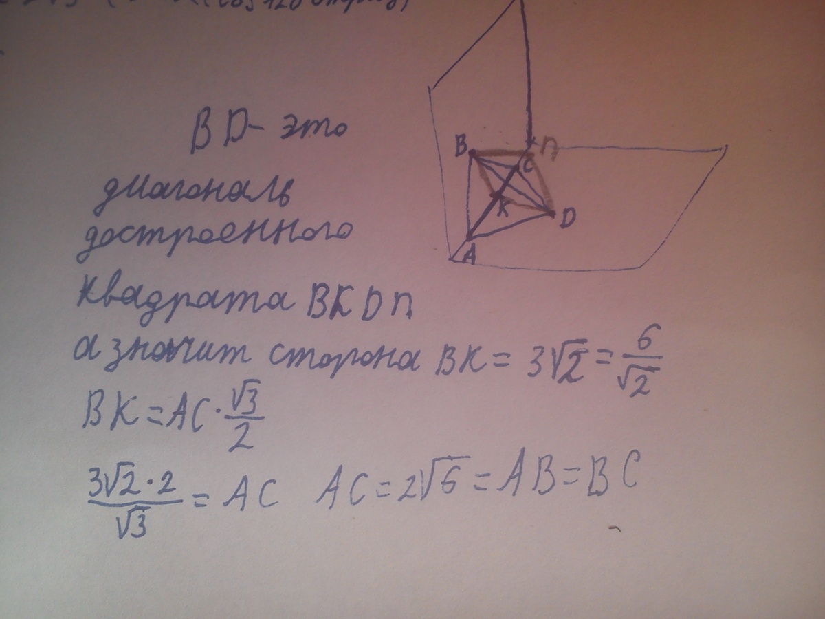 2-Два равносторонних треугольника АВС и АDC лежат в перпендикулярных плоскостях, точка К-середина отрезка АС. Вычислите длину отрезка АВ,если ВD=6 см