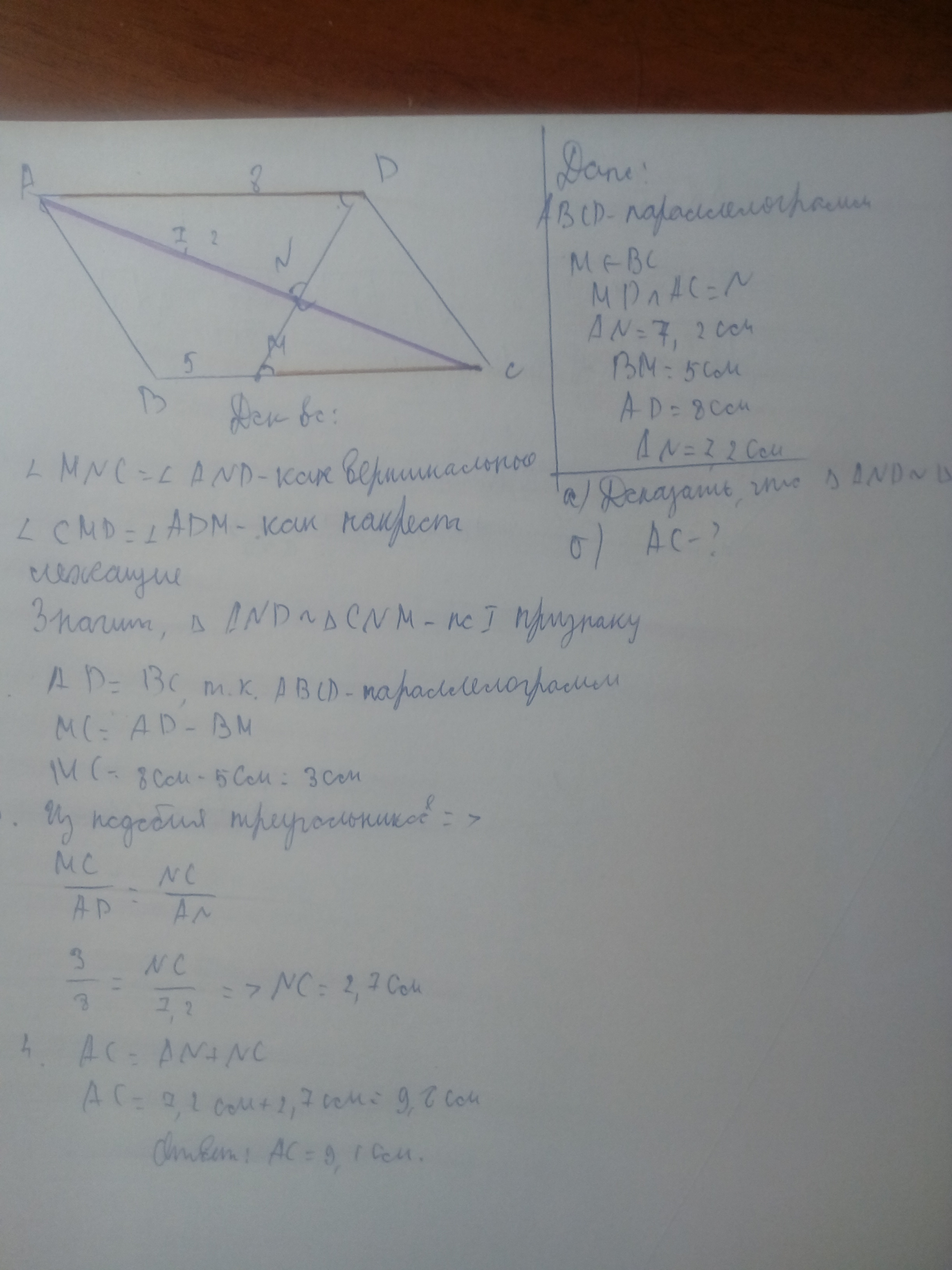 б) Найдите длину диагонали AC, если известно, что AD=8см, BM=5см, AN=7,2см.