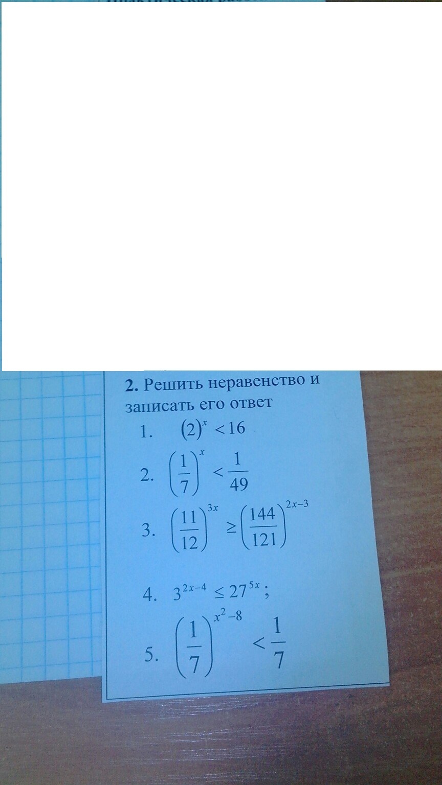 3.  (frac{11}{12} ) ^{3x}  geq ( frac{144}{121} ) ^{2x-3}  \ (frac{12}{11} ) ^{-3x}  geq ( frac{12}{11} ) ^{2(2x-3)} \ -3x geq 4x-6 \  x leq  frac{6}{7}  \ 4.   3^{2x-4}  leq 27 ^{5x}  \ 3^{2x-4}  leq 3 ^{15x} \ 2x-4 leq 15x \ -13x leq 4 \ x geq  frac{-4}{13}  \ 5.  (frac{1}{7} ) ^{ x^{2} -8}  textless   frac{1}{7}  \  x^{2} -9 textgreater  0, \  x textless  -3, x textgreater  3