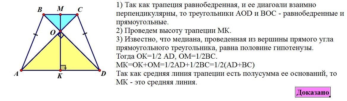 Докажите, что если в равнобедренной трапеции диагонали взаимно перпендикулярны, то её высота равна средней линии