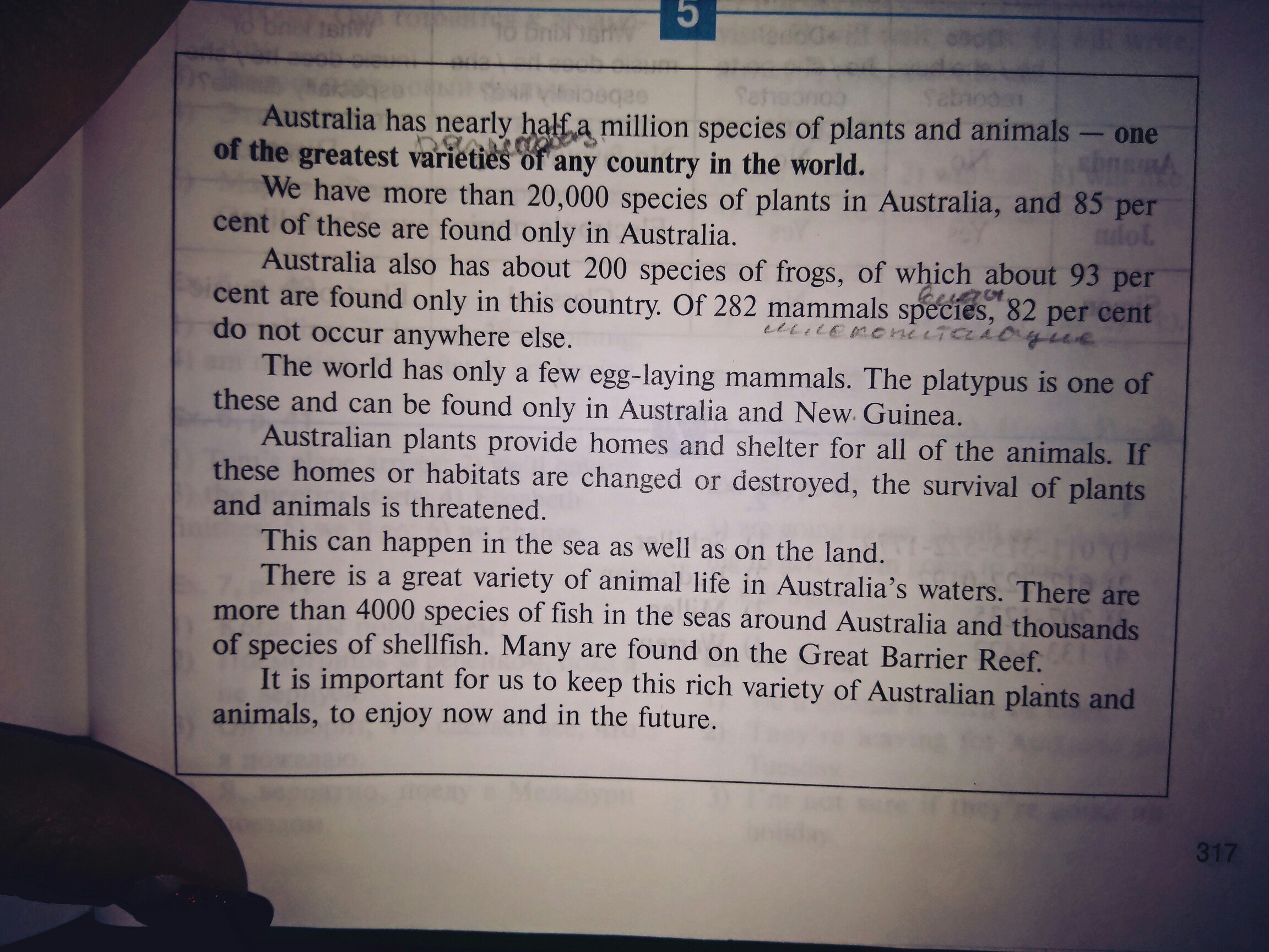 В Австралии почти полмиллиона различных видов растений и животных,гораздо больше,чем во многих других местах.В Австралии более 20 000 видов разных растений,и 85% из них существуют только в Австралии. В Австралии живут 20 видов разных лягушек и из них около 93% живут только в этой стране.Из 282 видов млекопитающих 82% видов не существуют больше нигде.В мире существует всего несколько видов млекопитающих,откладывающих яйца и утконос является одним из них,его можно найти в Австралии и Новой Гвинеи. Австралийские растения дают кров и защиту всем животным.Если эти места проживания будут разрушены,существование растений и животных будет под угрозой уничтожения.Это может произойти и в море и на суше.В морских водах Австралии огромное разнообразие животной жизни.В морских водах вокруг Австралии существует более 40 видов рыб и тысячи разных видов раковин. Многие из них живут на Великом Рифе.Для нас важно сохранить это богатое разнообразие Австралийских животного и растительного мира,чтобы мы могли получать удовольствие и видеть их в наше время и в будущем.