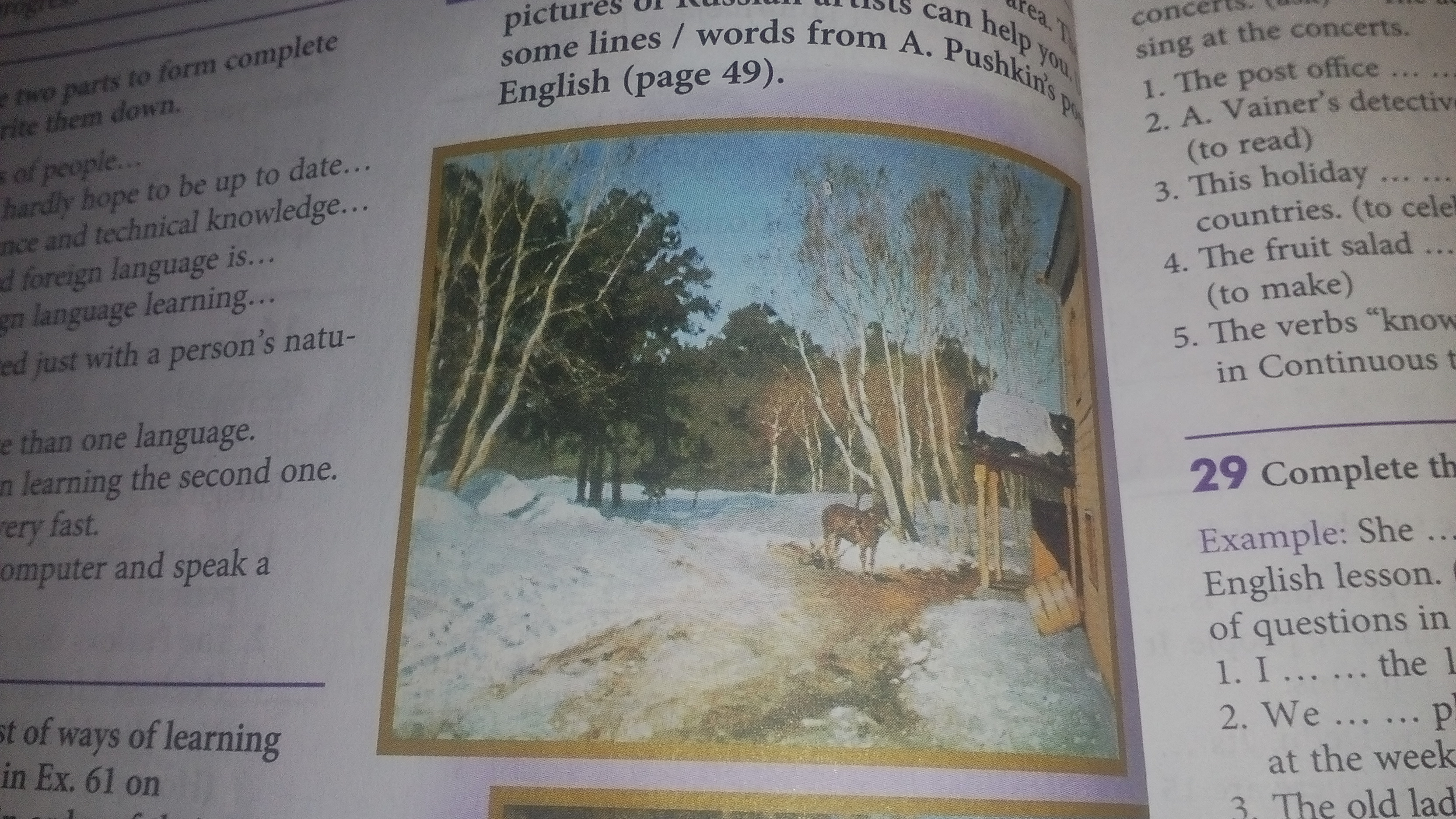 there are trees,path(тропинка),horse and house.It's winter because there is snow.this is a village.picture is so beautful.i like this.