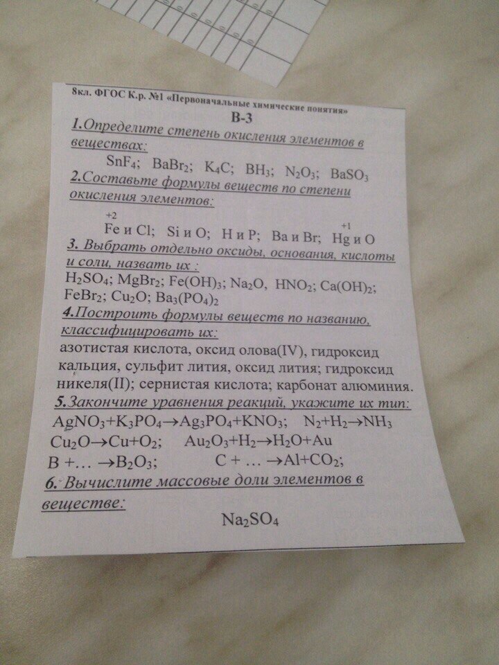 Sn(+4)F(-1)4; Ba(+2)Br(-1)2, K(+1)4C(-4), B(-3)H(+1)3, N(+3)2O(-2)3, Ba(+2)S(+6)O(-2)4