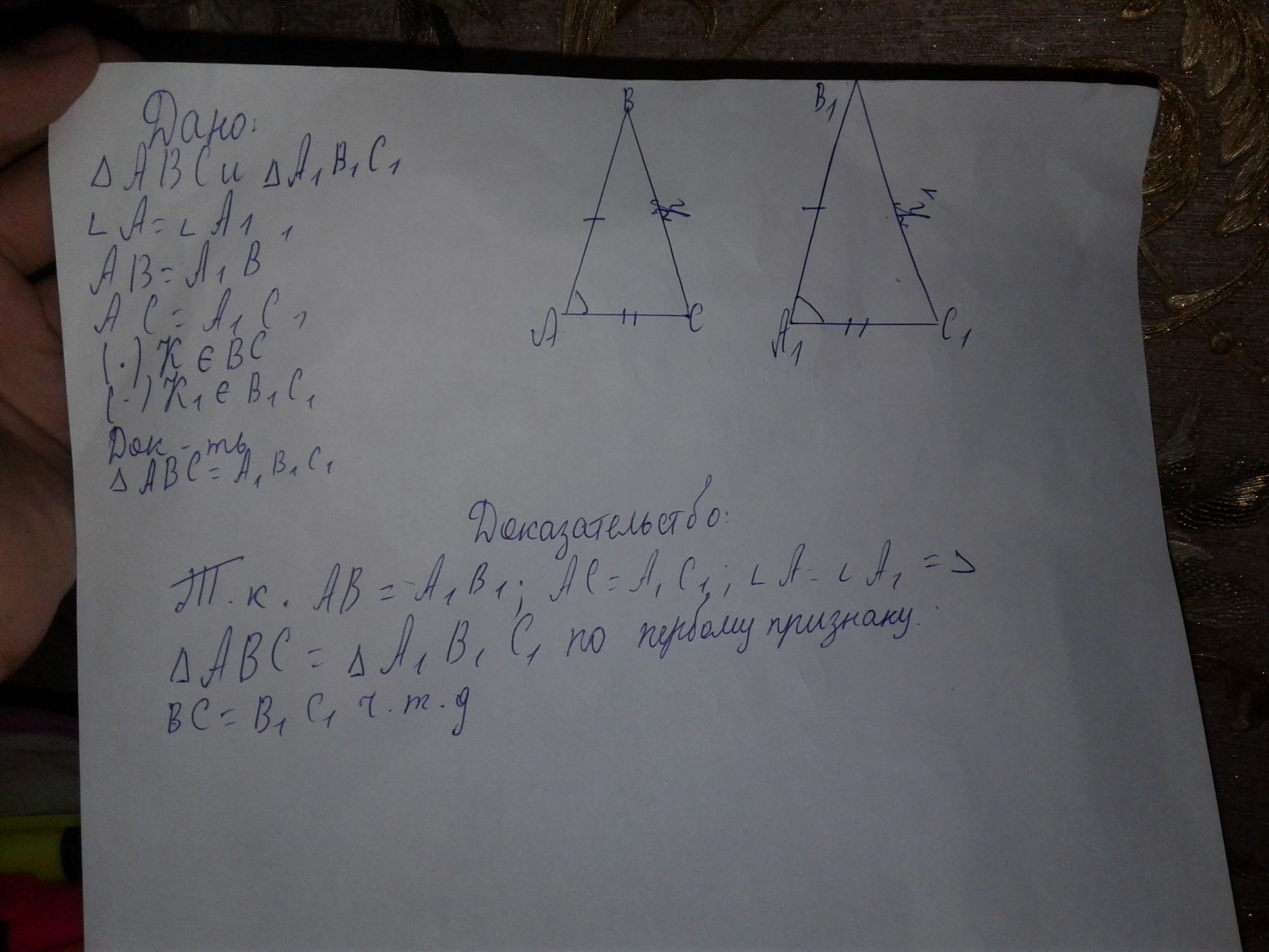 Известно, что в треугольниках ABC и A1B1C1, Угол А=А1; AB=A1B1; AC=A1C1, на сторонах BC и B1C1 отмечены точки K и K1, такие что CK=C1K1. Докажите, что треугольник ABK=A1B1C1 , желательно с рисунком!