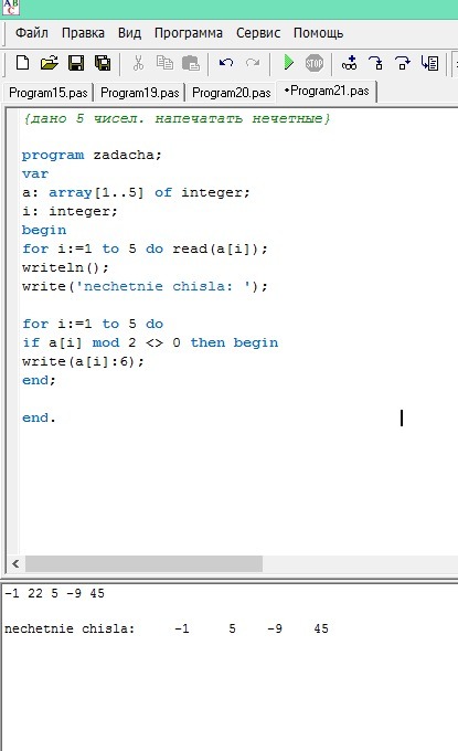 program zadacha;vara: array[1..5] of integer;i: integer;beginfor i:=1 to 5 do read(a[i]);writeln();write('nechetnie chisla: ');