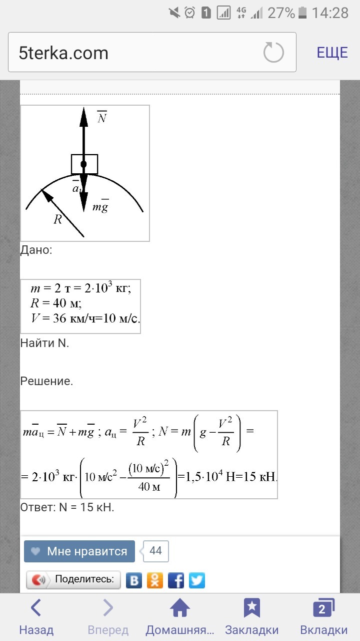 Массасы 2т автомобиль қисықтық радиусы 40м дөңес көпірден 36км/сағ жылдамдықпен жүріп өтеді.Автомобиль көпірдің ортасына қандай күшпен қысым түсіреді?