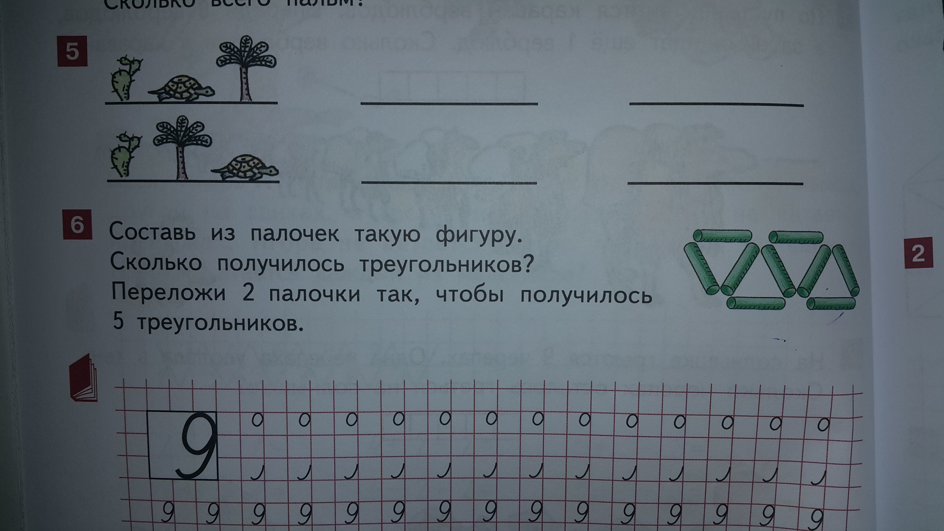 Здесь 4 треугольника. Чтобы было 5, надо 2 боковые палочки переложить в два треугольника, тогда получится 5 треугольников