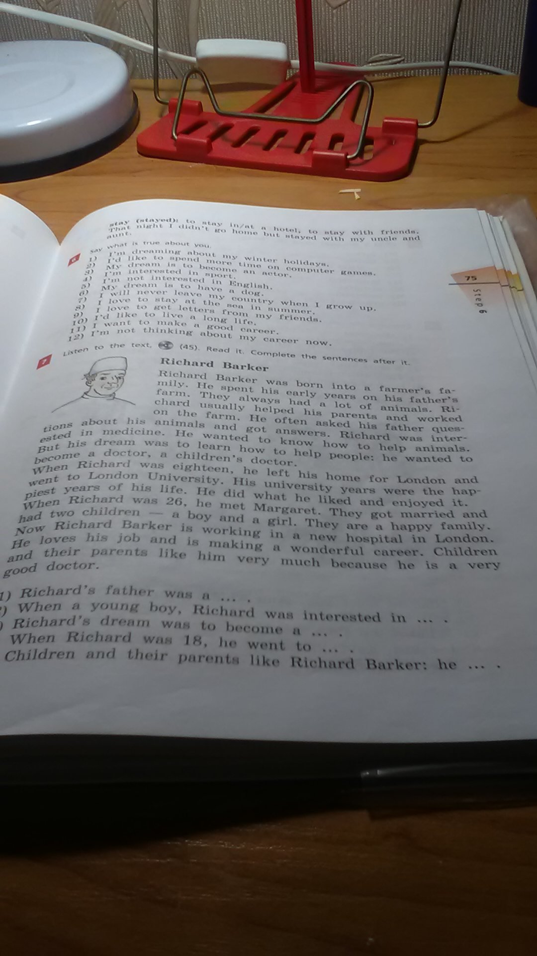 Ричард Баркер родился в семье фермера. Он проводил свои ранние года на ферме отца. У них всегда было много животных. Ричард всегда помогал папе и работал на ферме. Он часто задавал отцу вопросы про животных и получал ответы. Он был заинтересован в медицине и хотел узнать как можно помочь животным. Но в его мечтах была помощь людям. он хотел стать детским доктором. Когда ему исполнилось 18 он уехал в Лондон и поступил в университет. Года в университете были самыми лучшими в его жизни. он делал что хотел и ему это нравилось. Когда ему стало 26,он встретил Маргариту и женился. После чего у них появились дети-мальчик и девочка. яони счастливая семья. Сейчас он работает в больнице в Лондоне,он сделал себе прекрасную карьеру. Родные его очень любят,ведь он хороший доктор.