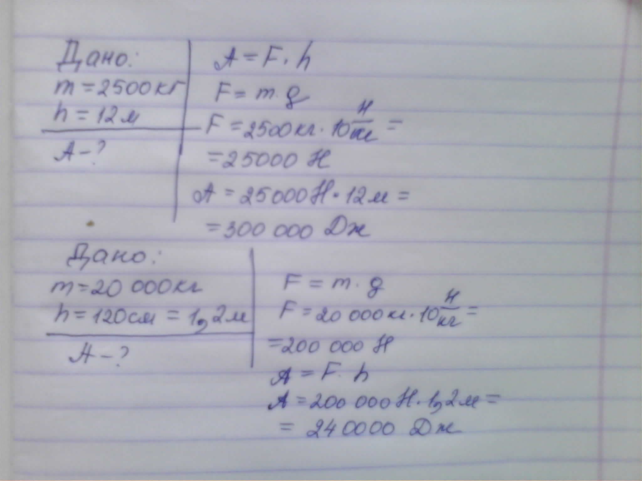1)При помощи подъёмного крана подняли груз массой 2500 кг на высоту 12 метров . какая работа при этом совершается ? 2) Какая работа совершается при подъёме гидравлического молота массой 20 т на высоту 120 см? (решение)
