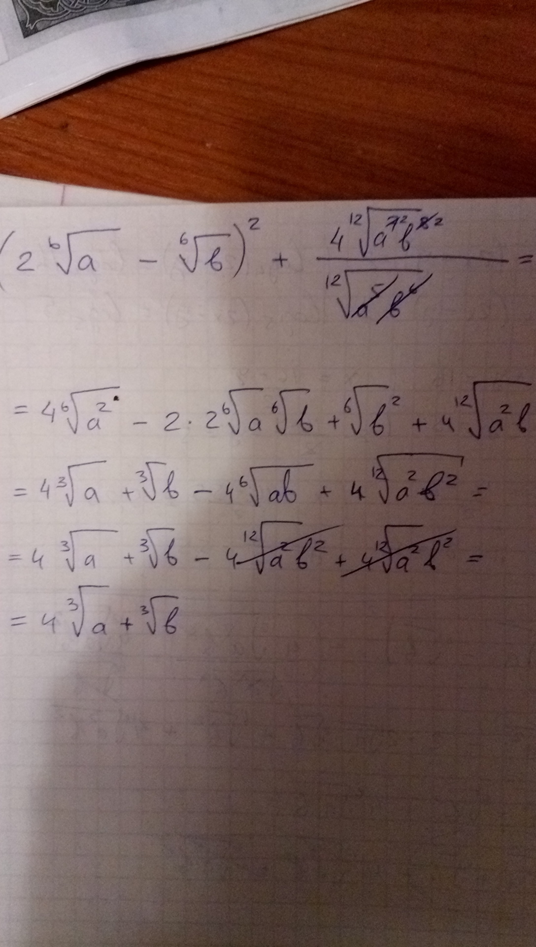 (2 корень шестой степени из a -корень шестой степени из b)^2 + 4 корень 12-ой степени из a^7 b^8 : корень 12-ой степени из a^5 b^6