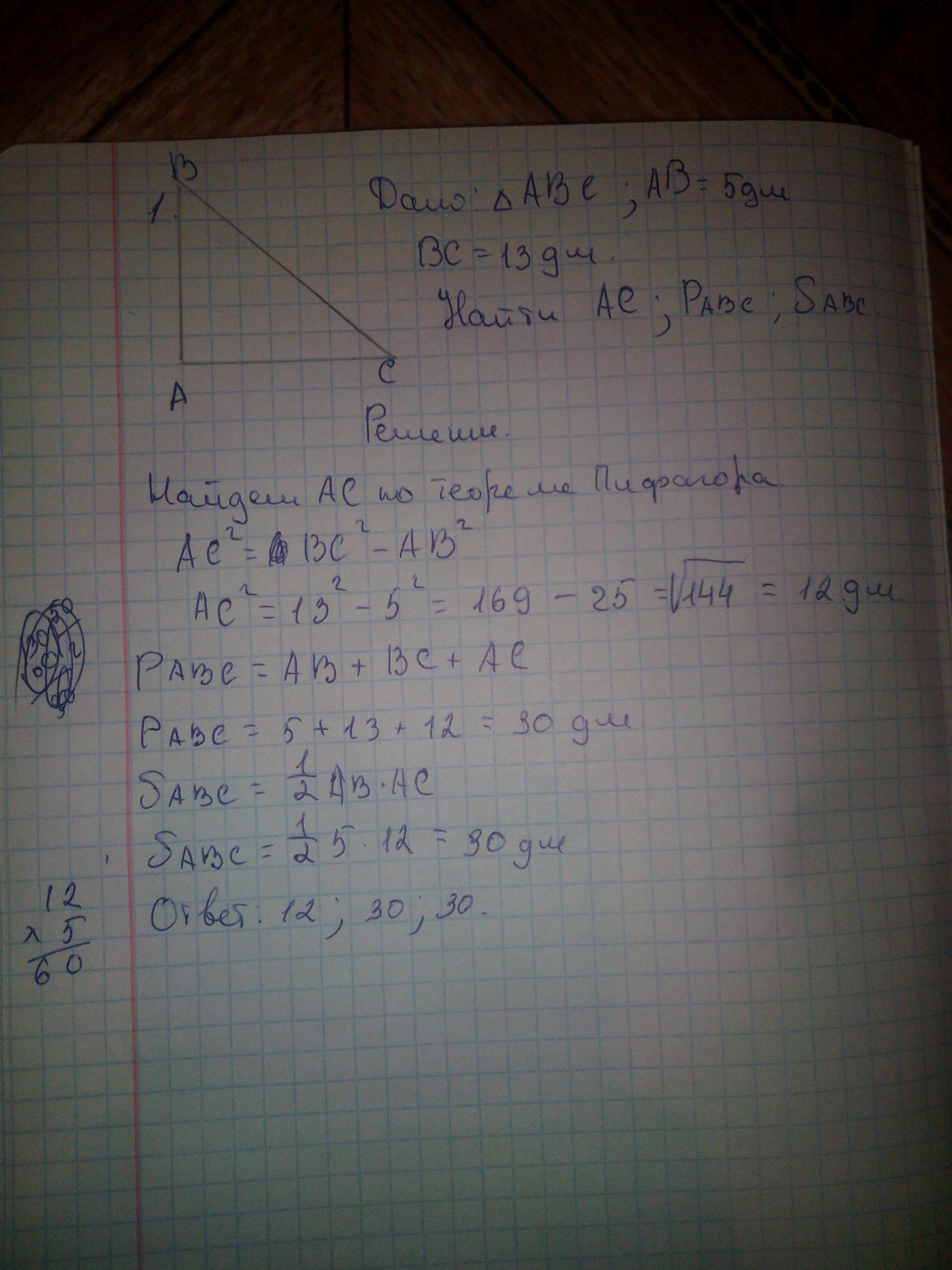 1) один из катетов прямоугольного треугольника равен 5 дм, а гипотенуза 13 дм. Найдите второй катет, площадь и периметр треугольника.