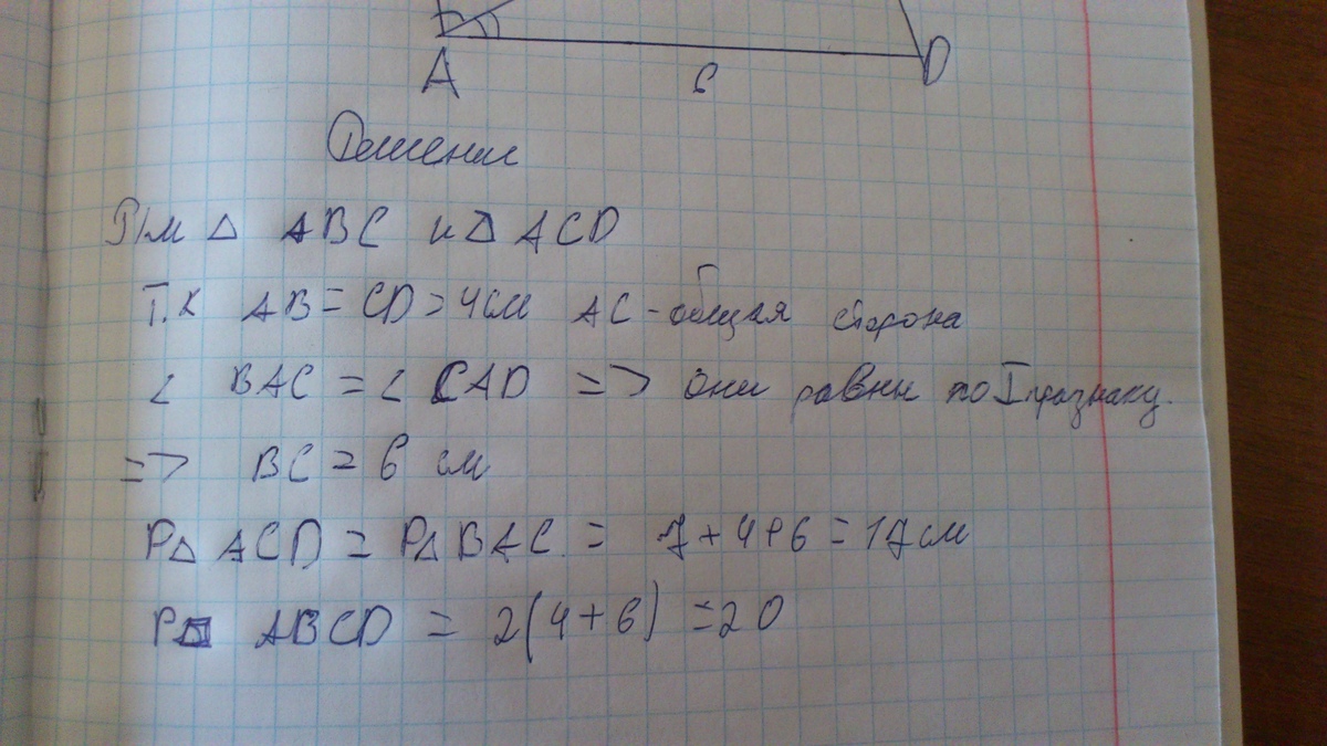 В четырёх угольнике ABCD AB=CD, .угол BAC= углу ACD, AC=7см, AD=6см, AB=4см.Чему равен периметр треугольника?