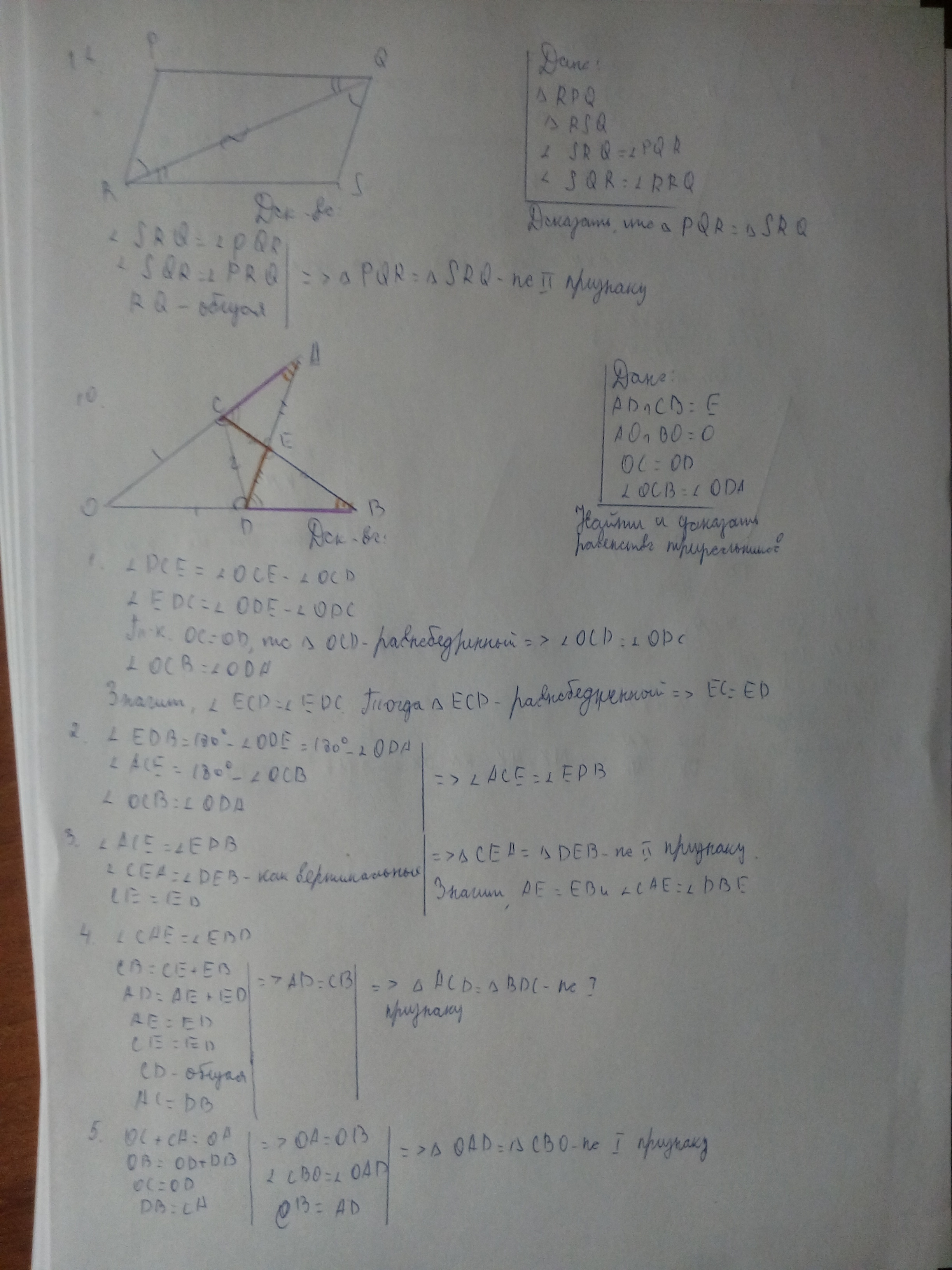 Рассмотрим ΔRPQ и ΔRSQ RQ общая сторона по условию∠QRS=∠PQR по условию ∠PRQ=∠RQS также по условию. Значит треугольники равны по стороне и двум прилежащим к ней углам. То есть они равны по второму признаку равенства треугольников.