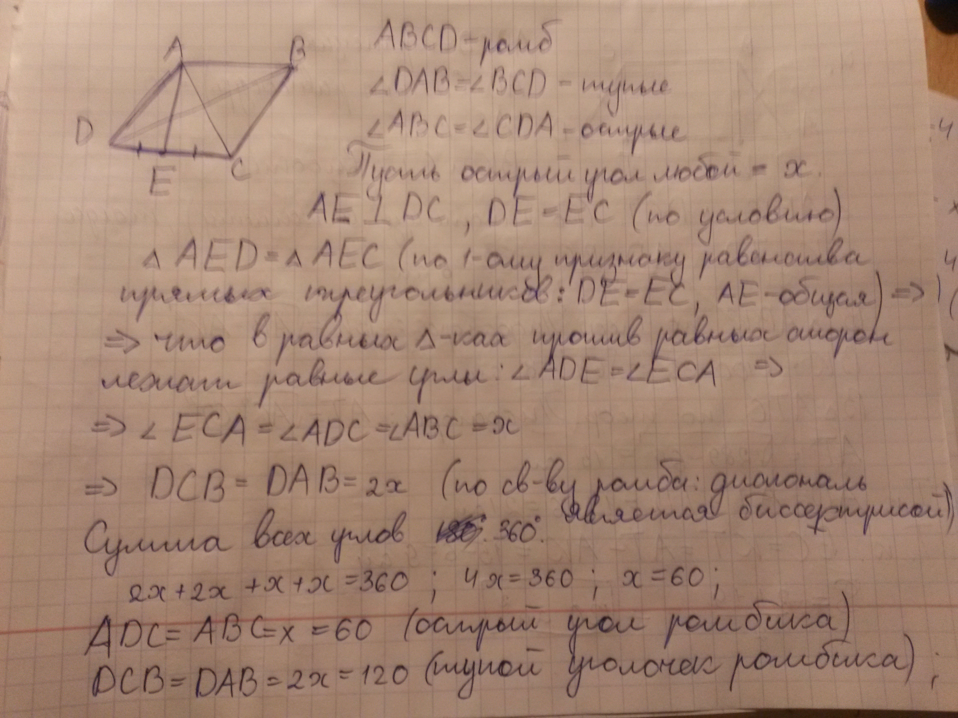 3)Из вершины тупого угла ромба проведен перпендикуляр к его стороне,делящий эту сторону пополам. Найдите углы ромба.
